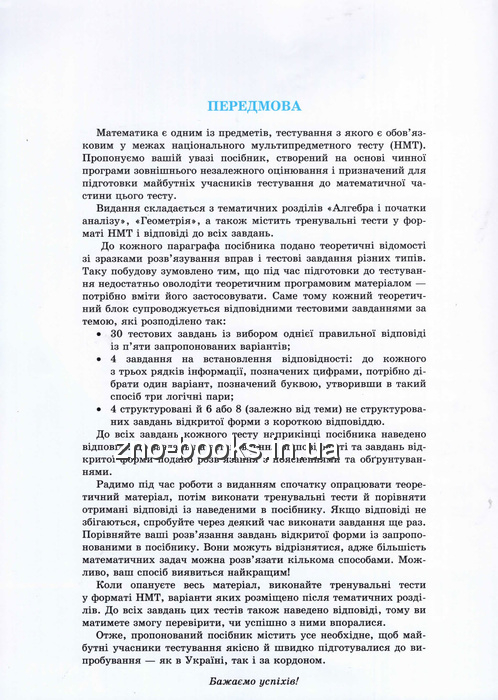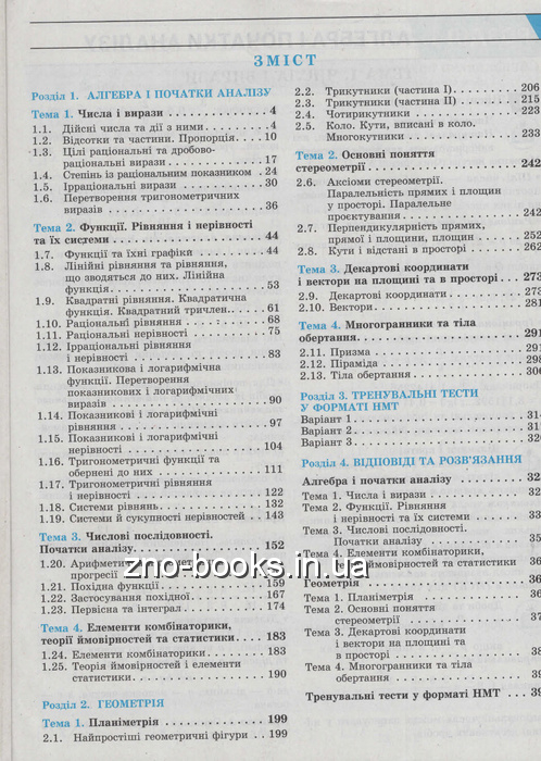 Видання складається з тематичних розділів «Алгебра і початки аналізу», «Геометрія», а також містить тренувальні тести у форматі НМТ і відповіді до всіх завдань.