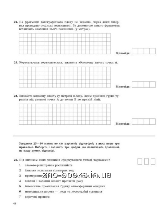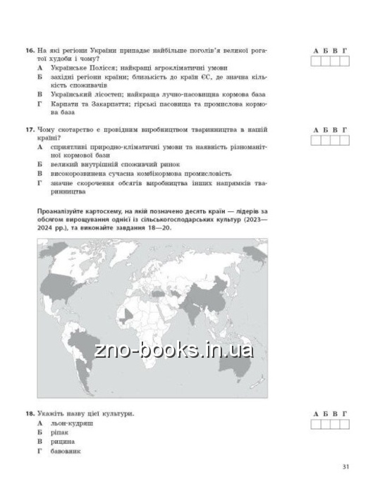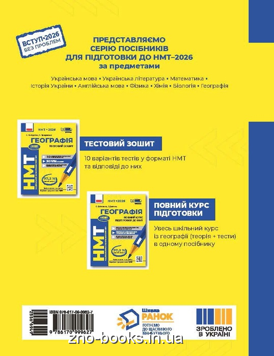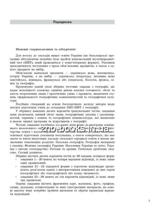 Видання є збірником тестів з географії, що містять Усі основні типи завдань, які використовуються під час національного мультипредметного тесту. У посібнику наведено відповіді до всіх завдань. Посібник має електронну підтримку. Призначено для учнів закладів загальної середньої освіти, абітурієнтів і вчителів географії.