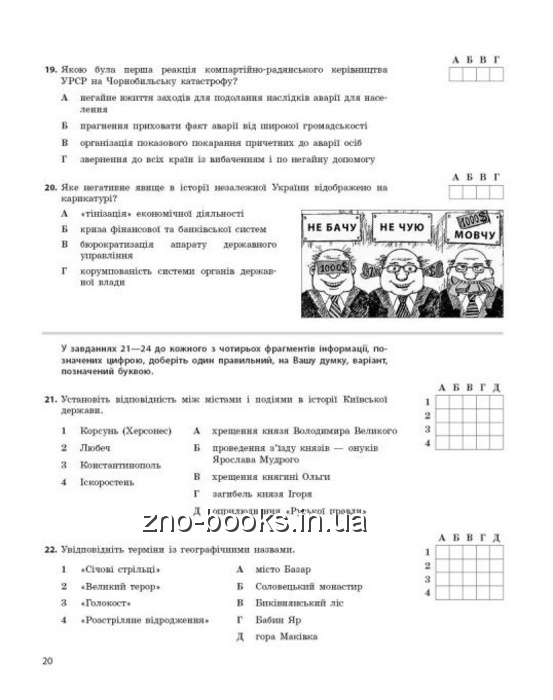 20 завдань з вибором однієї правильної відповіді із чотирьох варіантів;