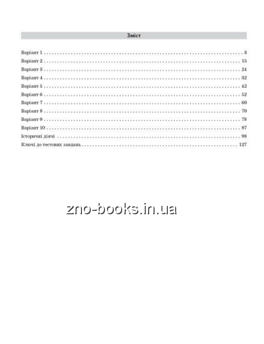 Видання являє собою збірник тестів з історії України, що містять усі основні типи завдань, які використовуються під час національного мультипредметного тесту. У посібнику наведено відомості про історичних дічів та правильні відповіді до всіх завдань.