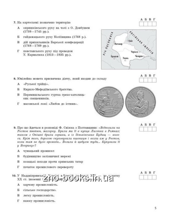 Пропонуємо вашій увазі посібник, що надає можливості кожному, хто готується до складання НМТ з історії України, оцінити рівень власної підготовки; обсяг та якість теоретичних знань і практичних вмінь з предмета, визначити ступінь сформованості предметних компетентностей та історичної культури. Видання складається з двох частин. У першій частині наведено 10 тестових блоків з історії України у форматі НМТ, у другій - відомості та зображення історичних діячів. Також наводяться правильні відповіді до всіх завдань.