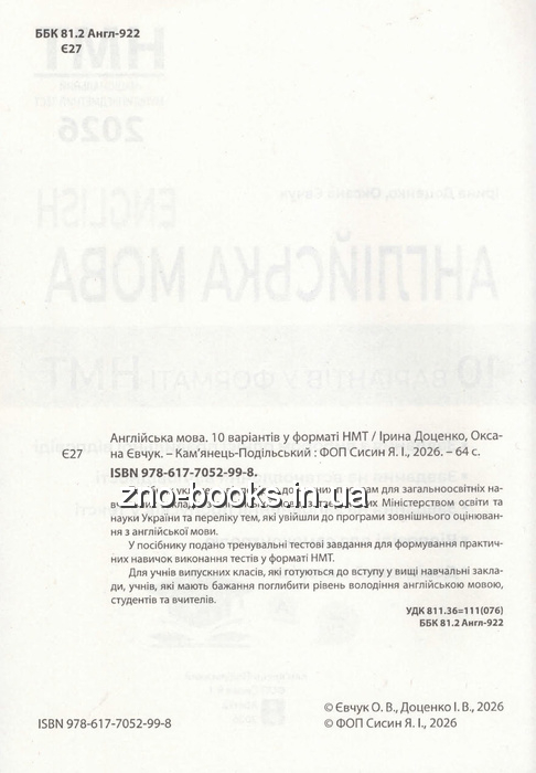 Посібник містить тренувальні завдання, які допоможуть випускникам загальноосвітніх навчальних закладів на високому рівні підготуватися до НМТ ( національний мультипредметний тест ) з англійської мови.