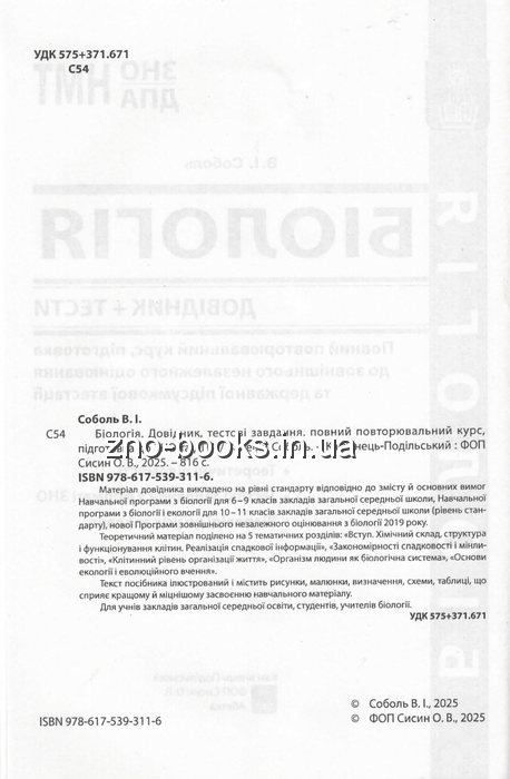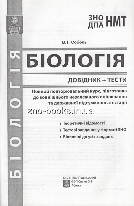 Соболь В. Біологія ЗНО НМТ 2026. Довідник + тести. Повний курс : видавництво Абетка. купити